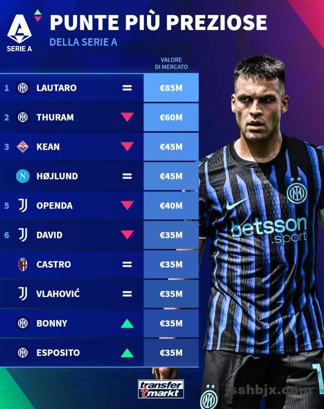 北京时间12月29日,德转列出目前意甲身价最高的10名中锋,劳塔罗以8500万欧元高居第一,马库斯-图拉姆6000万欧元第二,莫伊塞-基恩和霍伊伦同以4500万欧元并列第三。