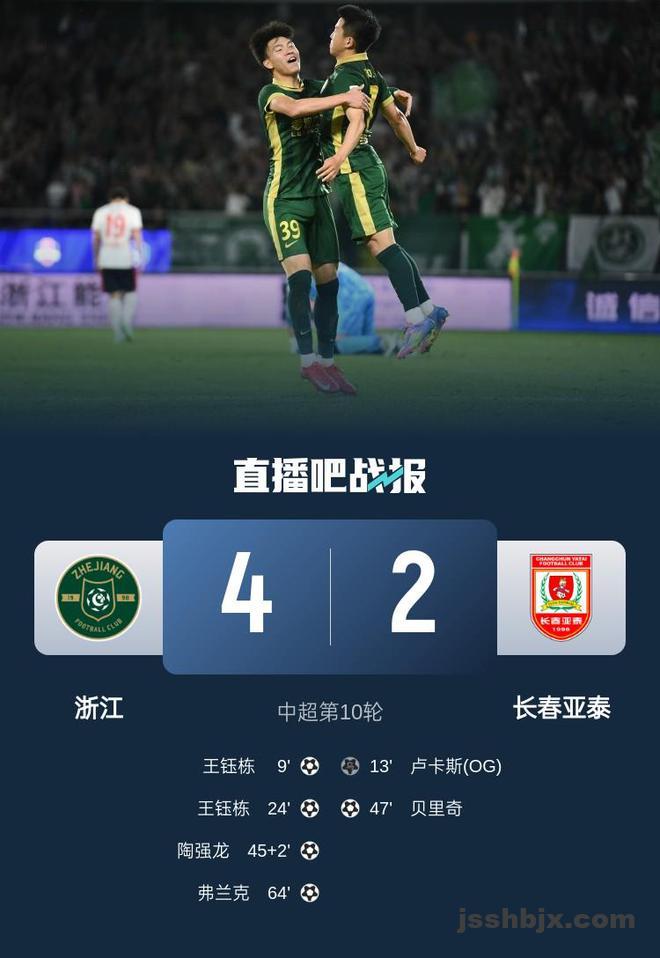 直播吧5月1日讯 北京时间5月1日19:00,中超第10轮,浙江队坐镇黄龙体育中心迎战长春亚泰。上半场,王钰栋小角度爆射破门,卢卡斯乌龙,王钰栋头球完成梅开二度,陶强龙传射;下半场,贝里奇扳回一球,程进第三次送上助攻,弗兰克破门。最终,浙江队4-2击败亚泰取得两连胜,积15分升至第6位,亚泰积5分排在第15位。