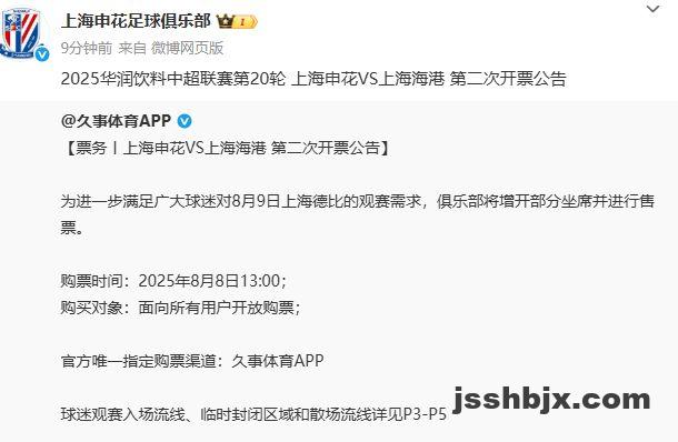 雷速体育8月8日讯 北京时间明天19点35分,中超第20轮,上海申花主场对阵上海海港。申花官方今日表示为满足更 […]