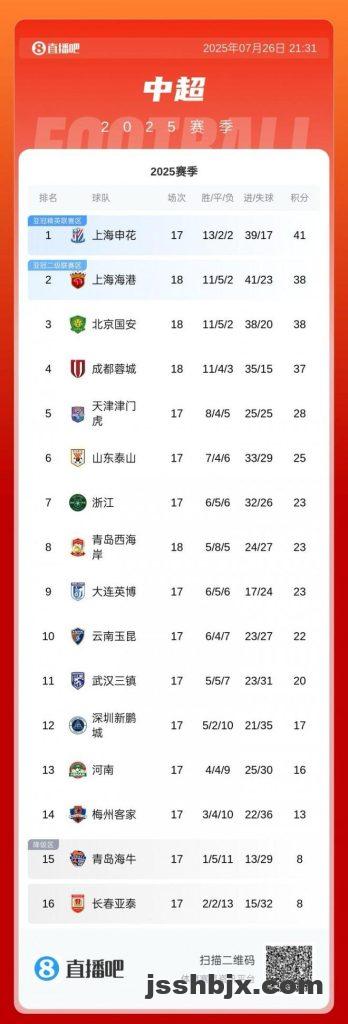 直播吧07月26日讯 今日本轮中超焦点战,国安客场0-2不敌蓉城,遭遇联赛两连败,海港2-2战平西海岸,最新中超积分榜如图。