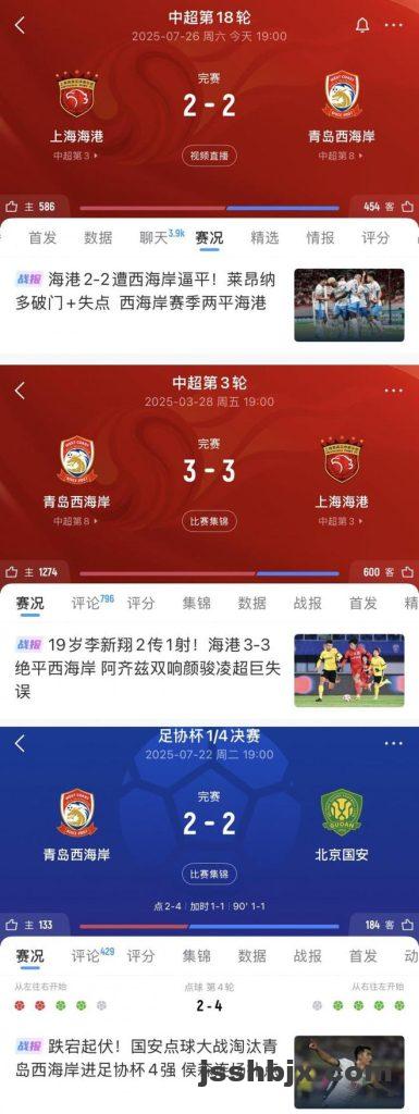 直播吧7月26日讯 中超第18轮,上海海港2-2战平青岛西海岸。