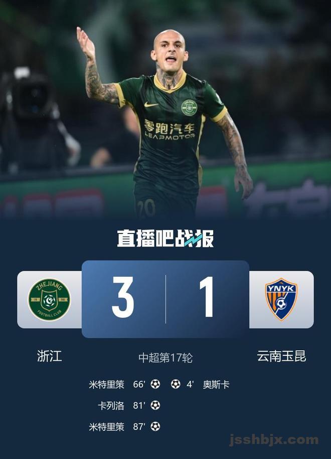 直播吧7月18日讯 中超第17轮,浙江主场迎战云南玉昆,比赛在杭州黄龙体育中心进行。上半场,侯永永助攻奥斯卡闪击破门,王钰栋失良机。易边再战,米特里策个人秀+任意球直接破门,浙江新援亚戈-卡列洛首秀替补建功。最终浙江队3-1云南玉昆。积分榜方面,浙江队23分暂升第七,玉昆22分第八。