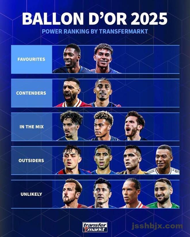 近日,德国转会市场网官方社媒发布了2025年金球奖的实力排名,其中,德转认为登贝莱与亚马尔是赢得金球奖的热门人选,巴萨和巴黎共有10人上榜。