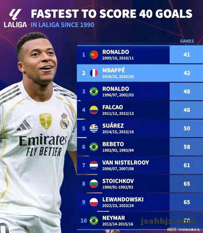 德国转会市场列出1990年以来最快达成西甲40球排名(场次):C罗——41姆巴佩——42罗纳尔多——48法尔考——48苏亚雷斯——50贝贝托——58范尼——61斯托伊奇科夫——65莱万——65内马尔——68