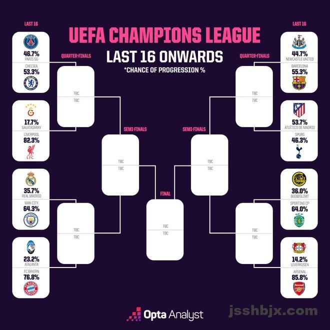 欧冠淘汰赛抽签结果出炉后,知名数据机构Opta预测了各队晋级八强的概率。