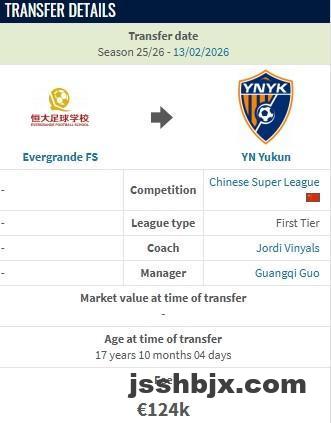 德转显示,云南玉昆约100万人民币从恒大足校签下布尼亚明。