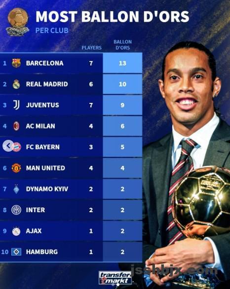 北京时间9月23日3点,2025年金球奖颁奖典礼将会在夏特莱剧院举行。在颁奖典礼举办前,德国转会市场发布了俱乐部金球奖数量排名,为颁奖典礼预热。