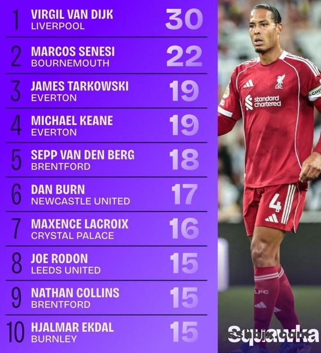北京时间8月28日,据Squawka统计,在2025/26赛季前两轮联赛中,利物浦中卫范戴克以30次解围高居榜首,领先优势明显。