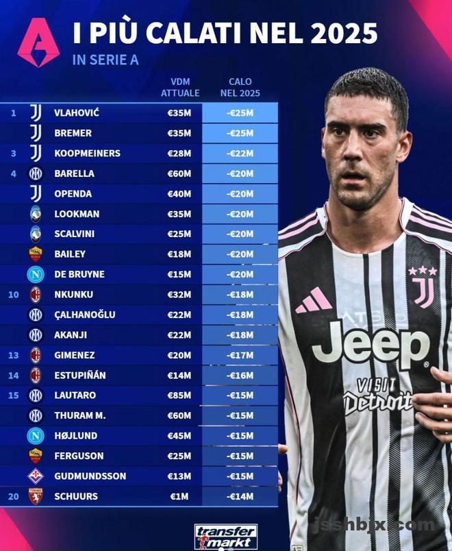 北京时间12月31日,德转列出了意甲2025年球员身价跌幅榜,尤文图斯包揽前三,弗拉霍维奇和布雷默下跌2500万欧元并列第一,库普梅纳斯下跌2200万欧元第三。
