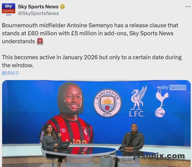 BBC则表示,此项条款需要在明年1月冬窗的前两周内激活,以便让伯恩茅斯有时间去买塞梅尼奥的替代者。