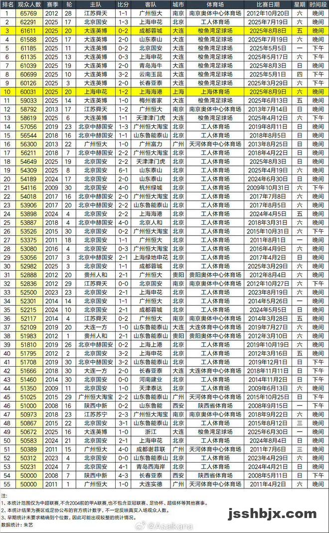 雷速体育10月4日讯 2025中超联赛第23轮补赛,大连英博坐镇主场迎战青岛西海岸,本场比赛的上座人数为61616人,这一人数也创下了梭鱼湾足球场上座人数的历史新高,排在中超历史第三位。 目前中超历史上座人数排行榜 谈球吧官网新闻中心 谈球吧 - 全网最专业的球类玩家问答网站新闻中心 切尔西2-1赢了!利物浦又被绝杀遭3连败!18岁巴西天才95分钟制胜 巴萨队医:亚马尔的伤病不是一周就能治好的,他必须停下来