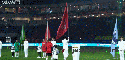 中超开幕式开始,首先是队旗入场环节