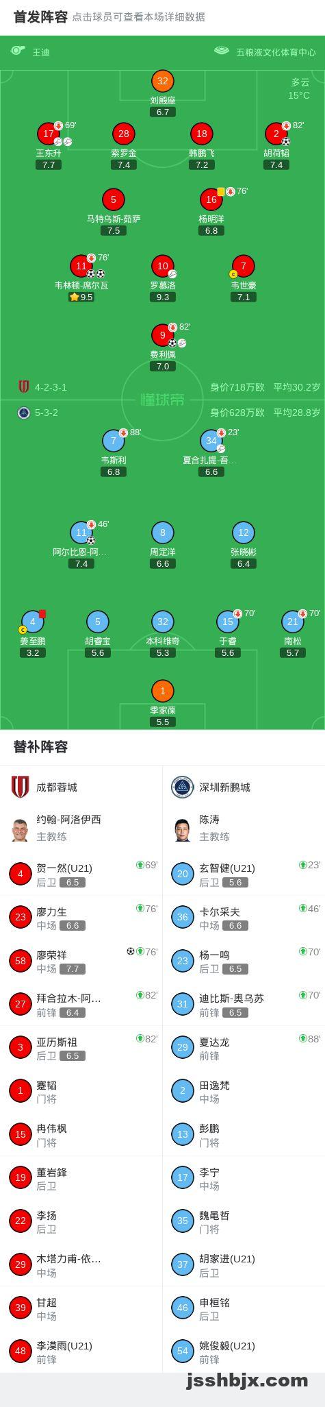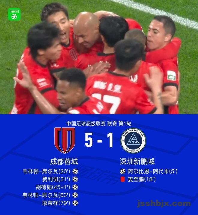 北京时间3月6日中国足球超级联赛 联赛 第1轮,成都蓉城主场对阵深圳新鹏城。成都蓉城韦林顿-席尔瓦梅开二度,费利佩破门,胡荷韬破门,廖荣祥破门。深圳新鹏城阿尔比恩-阿代米破门。最终比分成都蓉城 5–1 深圳新鹏城。