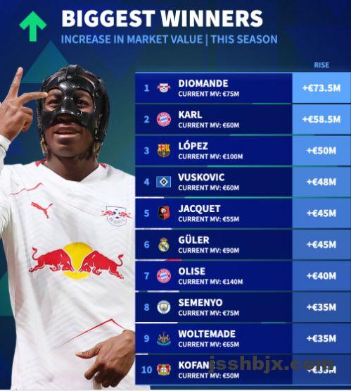 在3月份的更新完成后,该媒体特意盘点了一下本赛季五大联赛球员中,谁的身价涨幅最惊人。