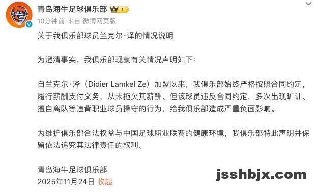 北京时间11月24日晚,中超青岛海牛俱乐部官方发文,回应了关于外援兰克尔-泽的欠薪指控。