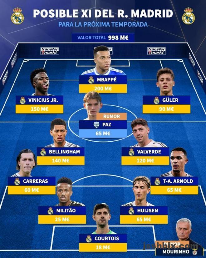 最近一段时间关于穆里尼奥回归皇马的消息沸沸扬扬,西甲豪门连续2个赛季遭遇四大皆空,下赛季自然要做出比较大的调整,邀请穆里尼奥回归就是非常关键的选择。德转也借着穆里尼奥回归的机会,预测了下赛季皇马的阵容,锋线三叉戟姆巴佩、维尼修斯和居勒儿,中场贝林厄姆搭档巴尔韦德,再加上今年夏窗回购的帕斯,后防线上则是卡雷拉斯、米利唐、赫伊森和阿诺德,门将的位置肯定是属于库尔图瓦。