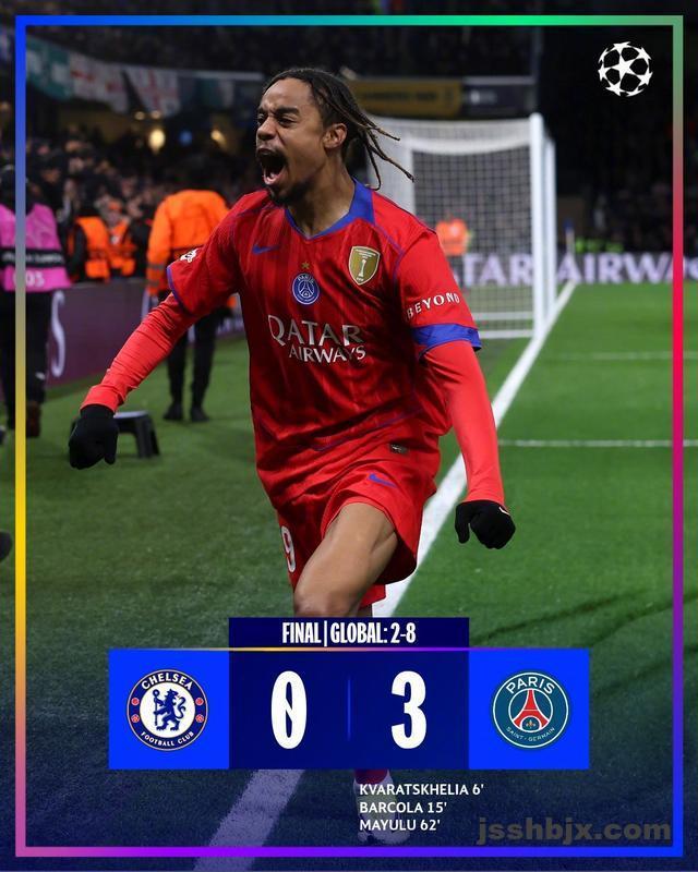 切尔西次回合回到主场,0-3不敌巴黎再次遭遇惨败。克瓦拉茨赫利亚、巴尔科拉、马尤卢各入一球,巴黎两回合总比分8-2横扫轻松挺进八强。