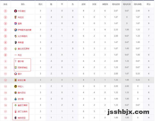 积分榜方面,随着维拉、罗马爆冷输球,贝蒂斯也无力赢球,本轮过后英超、西甲和意甲竟无一队能挤入前8,法甲和德甲则是各有一队进前8,里昂3连胜排在第3,弗赖堡2胜1平排在第6。中日德兰3连胜,1个净胜球优势力压布拉加和里昂领跑。惨遭逆转的维拉2连胜被终止,排名跌到第10,排在塞尔塔之后。贝蒂斯第16,诺丁汉森林第17,意甲两强更惨,博洛尼亚排在第18,罗马第23。