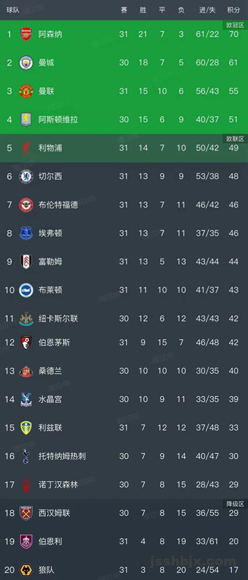 英超最新积分榜