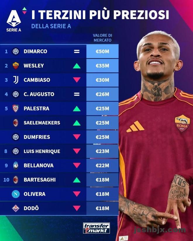 德转本周更新了意甲最新身价,今日德转晒出了意甲边后卫的身价TOP10榜单的,迪马尔科5000万欧继续排在第一,罗马右后卫韦斯利升至3500万欧超越坎比亚索来到第二位的。