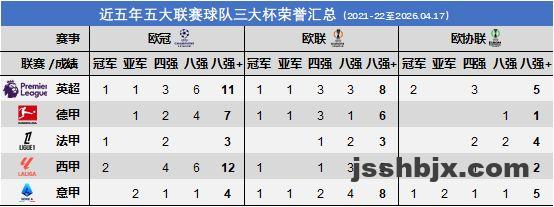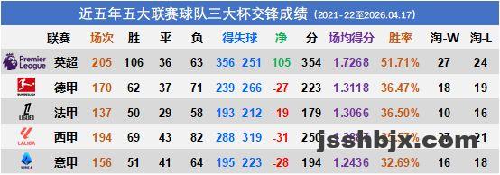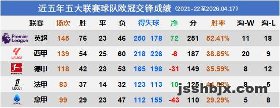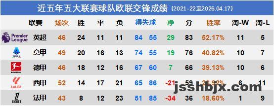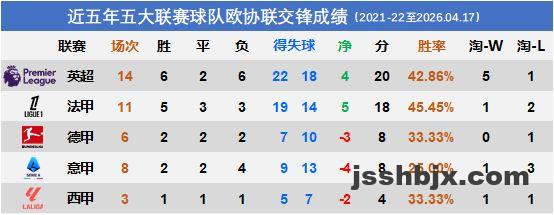 对英超胜负处于劣势,但淘汰赛暂时领先;对西甲胜负持平,但淘汰赛一败涂地;对德甲、法甲占据明显优势。