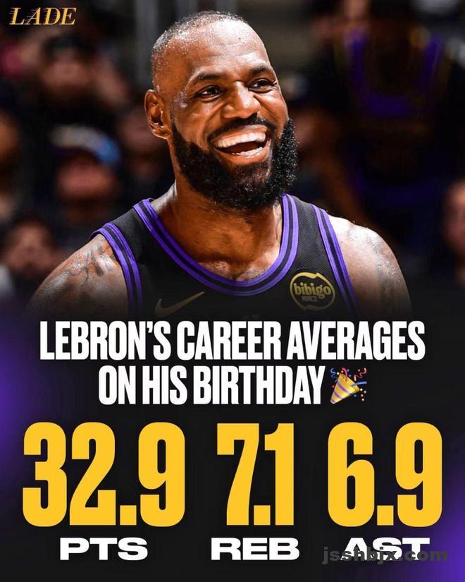 詹姆斯正式年满41周岁,作为现役最老的球员依然肩负率领湖人前进的重任。在詹姆斯生涯前10次NBA生日之战,他场均得到32.9分成为NBA生日夜场均得分最高的球员,力压威尔金斯场均32.7分与库里、奥尼尔场均29.4分。