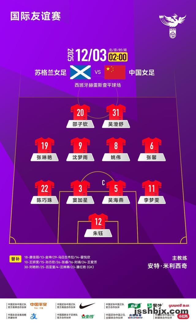 北京时间12月3日2:00,中国女足与苏格兰女足在西班牙赫雷斯查平球场进行一场友谊赛,赛前双方首发出炉。