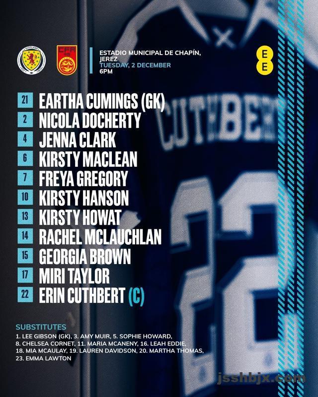 苏格兰女足首发:21-卡明斯、2-多彻蒂、4-詹娜-克拉克、6-麦克莱恩、7-格雷戈里、10-柯丝蒂-汉森、13-豪厄特、14-麦克劳克兰、15-乔治亚-布朗、17-米里-泰勒、22-卡思伯特