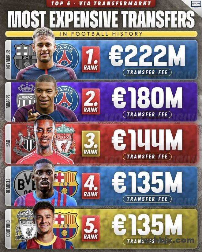 在目前历史最高昂的五笔交易中,内马尔、姆巴佩、登贝莱、伊萨克和库蒂尼奥占据了榜首。巴黎圣日耳曼和巴塞罗那包揽了其中的四次豪赌,但最终的收益率却完全不同。有人用持续的进球撑起了俱乐部的统治力,有人在反复的伤病中消磨了巨星光环,还有人彻底沦为转会历史的失败案例。亿元级别的转会费只是一张入场券,真正的性价比全靠球场上的硬数据和关键表现说话。接下来,我们将拨开身价的迷雾,用真实数据直接清算这五大最贵球员的回报率,揭开金钱背后的残酷真相。